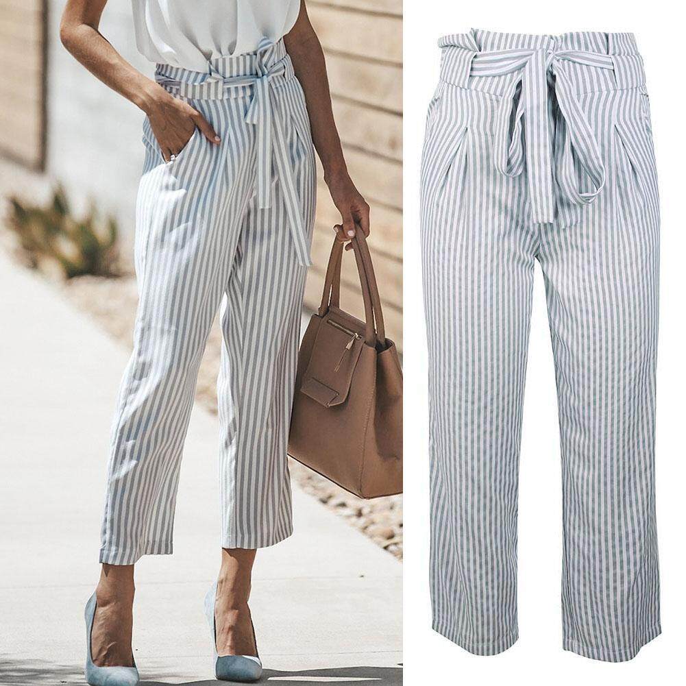 ลดกระหน่ำ 【Clearance Sale】【Wide Leg Pants】Fashionable Women Striped High-Waisted Ninth Pants Casual Wide Leg Trousers ราคา 89 บาท ในเวลานี้!!!